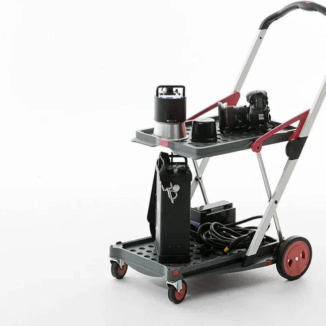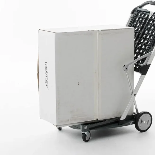 Securing straps are attached to secure the collapsible box. Accidental rolling away is prevented by activating the parking brake. Transport via stairs is made possible by its freestanding wheels. The wheels can be removed with a few easy steps, and stored in the base platform to save space.
