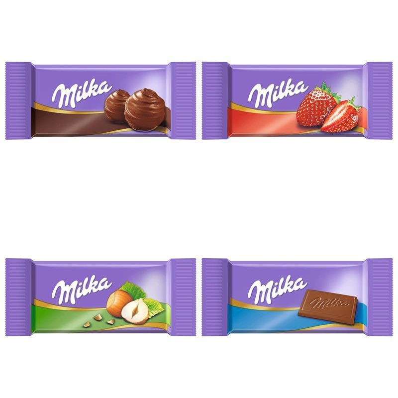 Milka Naps Mix. 1 x 1 kg Tin. Melt-in-the-Mouth Mini Chocolate Bars Made from Alpine Milk. Strawberry. Hazelnut and Crème au Cacao